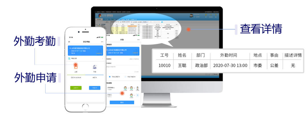 可通過移動(dòng)端自動(dòng)定位,填寫外勤事由及描述,選擇上、下班打卡信息,提交外勤申請;外勤管理員可通過移動(dòng)端進(jìn)行審批,審批通過,外勤考勤成功。