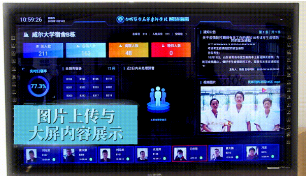 宿舍數(shù)據(jù)大屏應(yīng)用新增信息發(fā)布功能,支持上傳圖片、宣傳視頻和通知公告,可發(fā)布優(yōu)秀宿舍、各類通知、校園風(fēng)采等多樣化內(nèi)容。
