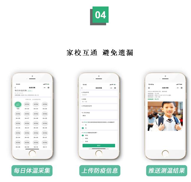 ● 學(xué)生在校時,家長可實時接收到小程序推送的學(xué)生測溫數(shù)據(jù);學(xué)生在家時,家長可通過小程序自行上報學(xué)生體溫,確保檢測不遺漏。